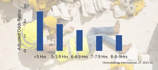 一篇涵盖了2004-2008、共17万多人的调查研究[1],在控制性别、年龄、种族、授薪阶级等变项后发现:工时的确是工伤发生的重要指标,除此之外,若以每天睡眠7-8小时为基准,睡6-7小时的话工伤风险提高为1.41倍、睡5-6小时为1.79倍、少于5小时则为2.65倍!