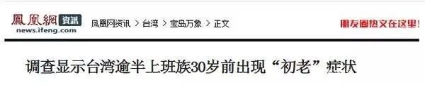 台湾早前就已经做了「上班族初老症状」的调查,据统计,有54%的上班族表示30岁以前就出现了初老的症状,其中19%还出现在20-25岁,另外的35%则是出现在25-30岁。