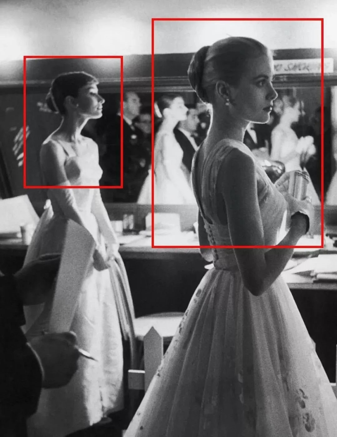 1956 年的奥斯卡颁奖典礼后台赫本和格蕾丝凯莉的照片,可以看出赫本脖子很修长,但依然前倾,而格蕾丝凯莉的肩颈则很挺拔。