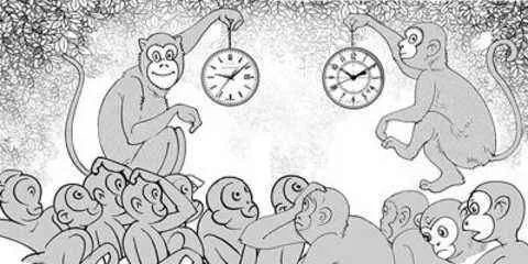 森林里生活着一群猴子,日子平淡而幸福 。一天一名游客把手表落在了树下的岩石上,被猴子猛可拾到了。聪明的猛可很快就搞清了手表的用途,于是,猛可成了整个猴群的明星,每只猴子都向猛可请教确切的时间,整个猴群的作息时间也由猛可来规划。猛可逐渐建立起威望,当上了猴王。 猛可认为是手表给自己带来了好运,每天在森林里寻找,希望能够拾到更多的表。功夫不负有心人,猛可又拥有了第二块、第三块表。每块手表的时间显示的都不相同,猛可不能确定哪块手表上显示的时间是正确的,因此它自身陷入了混乱,每当有猴子来问时间时,猛可总是支支吾吾回答不上来。于是威望大降,整个猴群的作息时间也变得一塌糊涂。