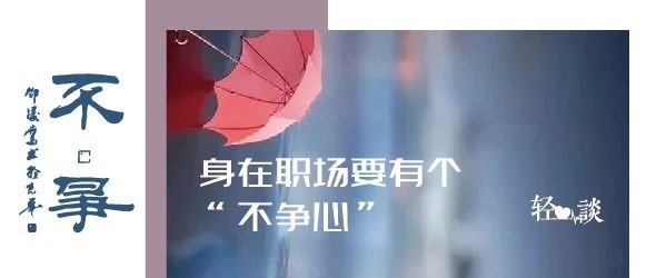 《道德经》第八十一句:“天之道,利而不害人之道,为而不争。”所谓“不争”,并不是让人无所作为,而是凡事要顺其自然,不要一味的强取豪夺。老子“不争”的内涵有三:一是争“下”,委屈之中求大功;二是争“德”,主张不自见、不自是、不自伐、不自矜;三是争“予”,争取多给别人。老子一向主张:退、守、弱、柔,从而保全了自己,立足不败之地。“为而不争”是人生修养的最高境界,结果是“以其不争,故天下莫能与之争。”虽然大家都说职场如战场,但是小编认为,人在职场更应该拥有“不争心”。这里所说的不争不是什么都不做,而是要有原则地把欲望控制在"知足”之内,根据自己的能力,根据自己的实际资源来期望自己协调好工作和生活的关系,不要成为"要职位不要生活”的工作狂,同时要切忌和同事攀比职位攀比薪水,要在竞争中培养欣赏别人的气度保持心理稳定,避免情绪大起大落。要知道“天外有天,人外有人”。